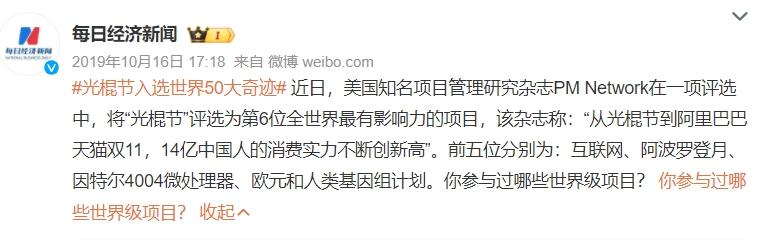 2019年10月,美国著名项目管理研究杂志《PM Network》“全球最具影响力的50个项目”入选,“双11购物节”入选互联网、阿波罗登月、人类基因组计划等,排名第六。该杂志指出,这场狂欢从根本上改变了人们的购物方式,打通了购物和娱乐的界限。