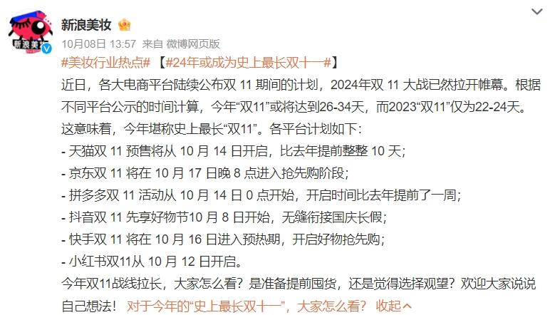 按照不同电商平台公布的时间计算,今年的“双11”可能达到26-34天,而2023双11只有22-24天。这类平台的行动也表明,今年的双十一变成了“历史上最早的双十一”,而且也是跨时最长的一届双11。