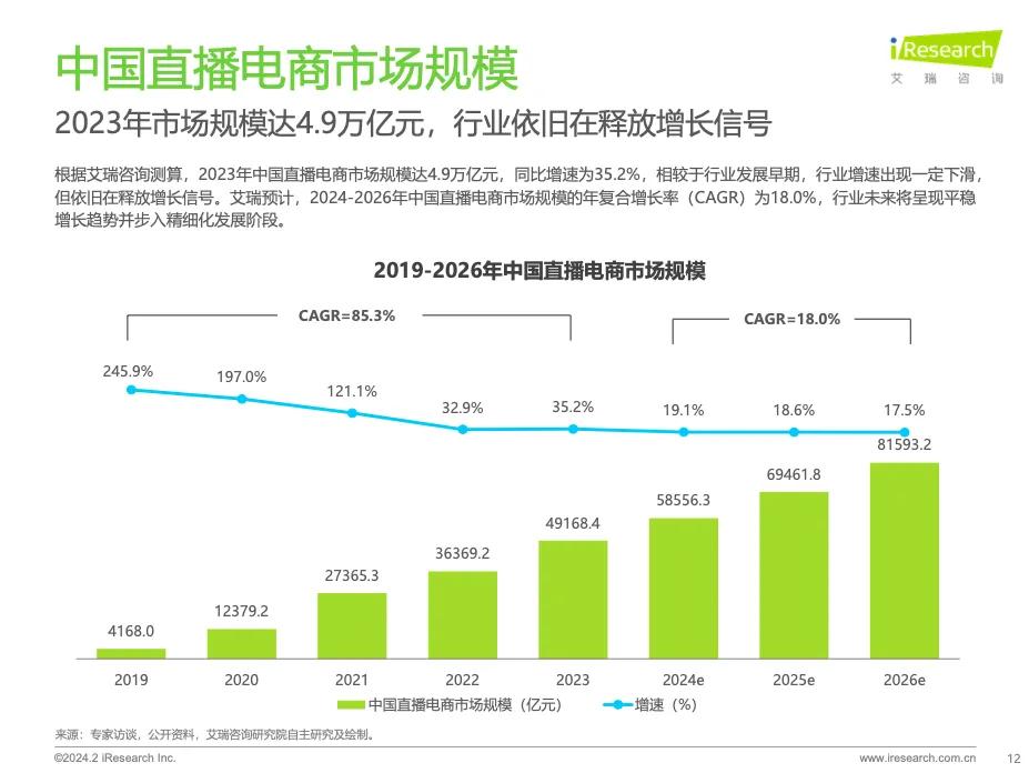 据艾瑞咨询报告调查数据显示,与行业发展初期相比,在2023-2026年间,中国直播电商市场的增速将会有所下降,未来行业将呈现稳定增长的趋势,并进入精细化发展阶段。。