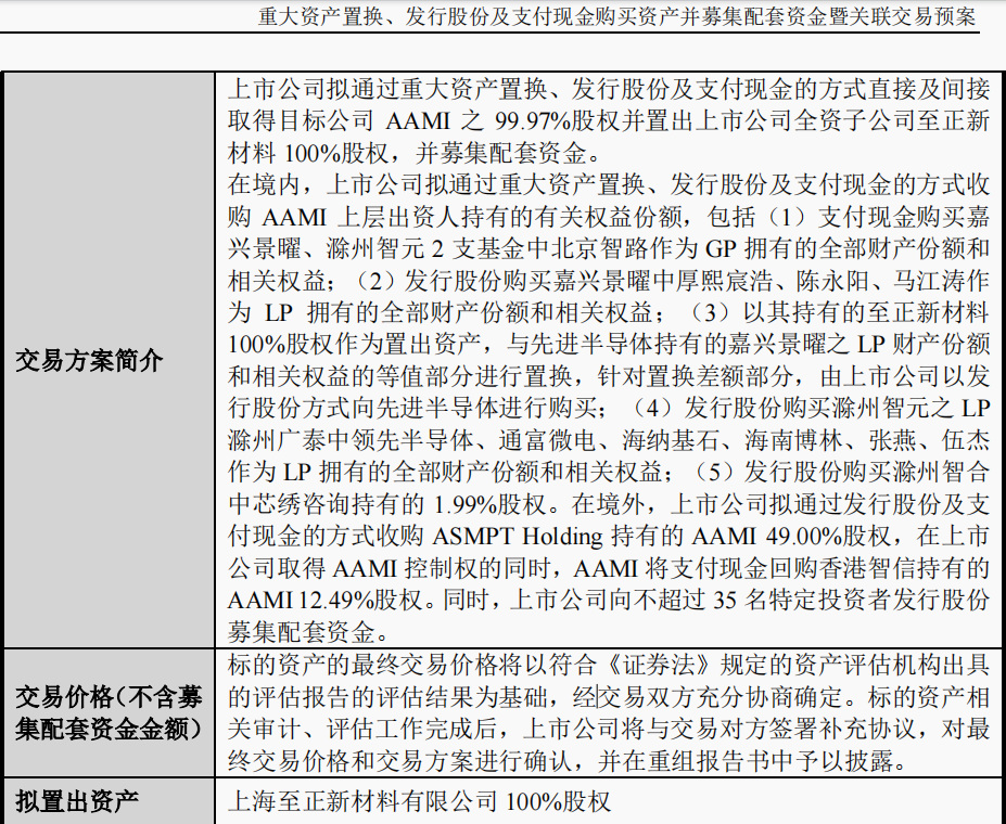 十月二十三日晚,至正股份发布交易计划显示,公司拟置入包括港股公司ASMPT在内的先进封装材料国际有限公司(以下简称AAMI)99.97%的股份。
