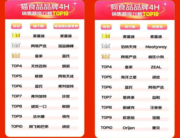 京东的数据显示,10月21开抢日前4小时,麦富迪占据了猫干粮、猫湿粮&猫零食、狗干粮和狗零食品牌4个销售额排行榜的第一名。