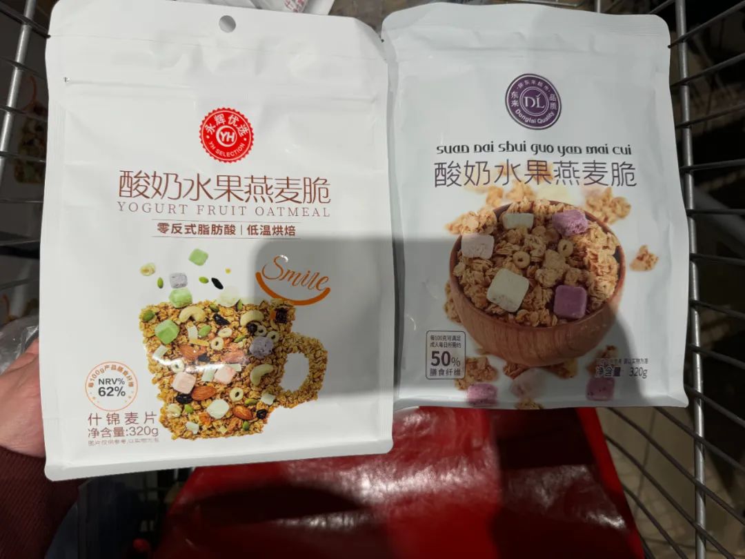 有趣的是,永辉自营的产品极其像胖东来,知危对比两家的麦片和洗衣液,包装几乎一模一样,不仔细看的话,甚至注意不到自己拿的是 “ YH ” 还是 “ DL ”。