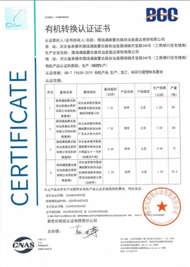 据王力民介绍,上述地块种植的四个生产基地的土豆不能称之为“有机土豆”。他提供的发证日期是2024年9月9日的“有机转换认证证书”,显示位于朝阳湾镇孤山村、黄土坎乡海字村等4个基地共100吨,均为有机转换产品。他指出,这个证书最初在商品链接中有明确的标记,但后来在他举报后下架了。