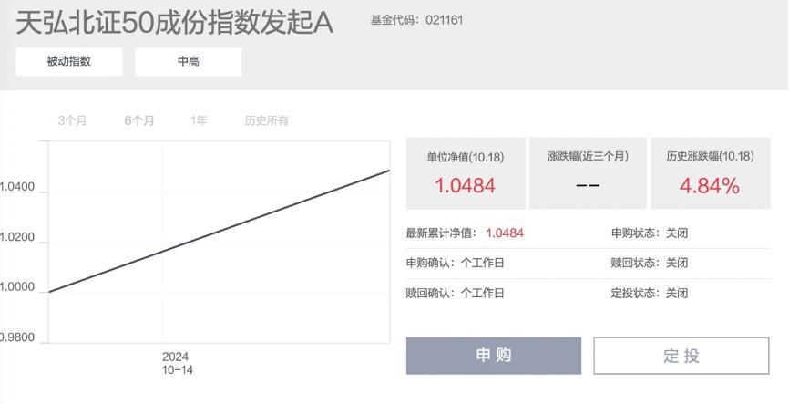 天弘基金官网显示,截至10月18日,该基金A类股份的单位净值已上升至1.0484。这意味着这只基金已经迅速开仓。