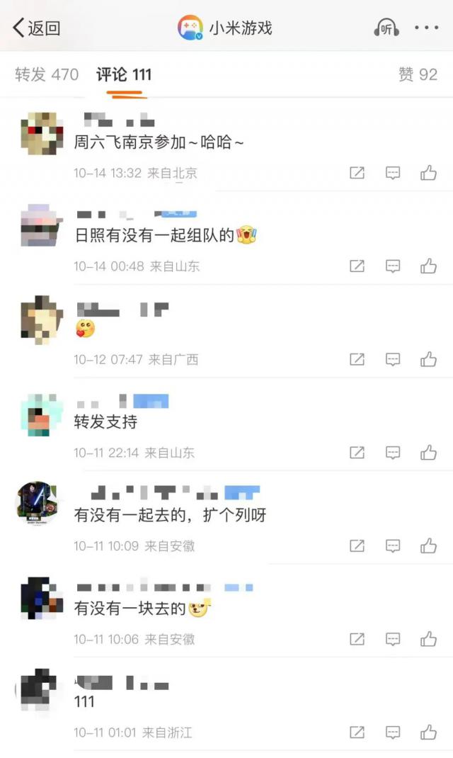 在小米游戏官方微博评论区,有来自世界各地的评论区。 IP,她们都希望能够蹲到一个游戏搭子和自己一起去南京。