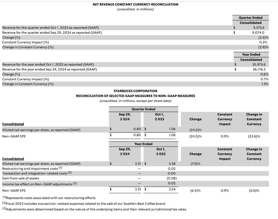 另外,从2024财年(截至9月29日的52周)来看,这也是一个不好看的“账”。在此期间,星巴克全球同店销售额下降2%,合并净收入增长 GAAP每股收益为3.31美元,达到1%,达到362亿美元,同比下降8%。