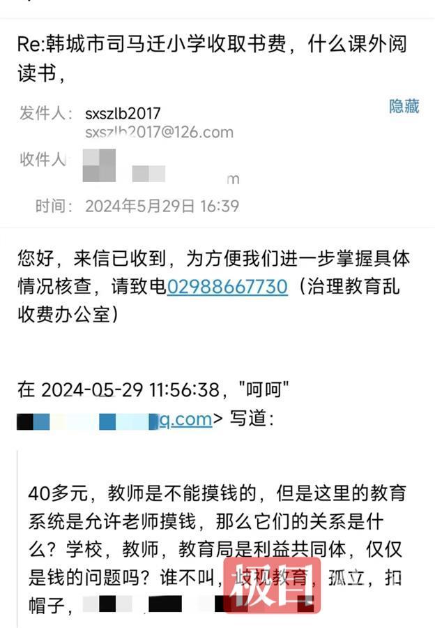 郭先生提到,直到2024年三年级第二学期过半,课外书才发出来。“暑假过了一会儿,三年级的课外书从来没有发过。”所以,他质疑学校收取48元的课外书费,以及延迟发放不合规。今年五月,他通过邮件向陕西省教育厅有关部门投诉此事。今年5月29日,郭先生收到回复,致电陕西省教育厅治理教育乱收费办公室,便于进一步掌握和审查相关情况。发送邮件投诉后,郭先生再次打电话反映详细信息。