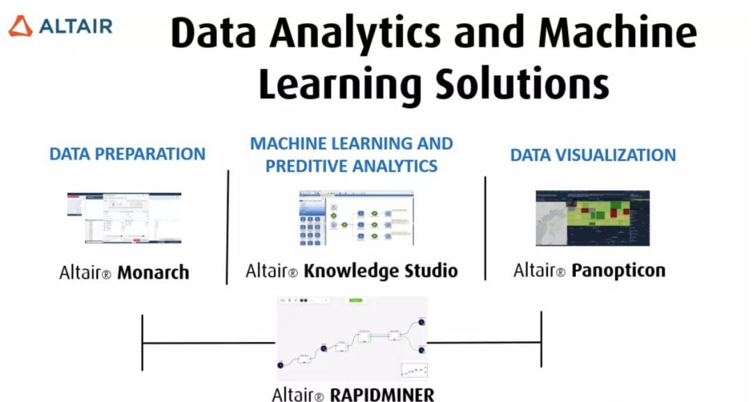 最后,在数据分析和机器学习方面,Altair包括一个强大的数据和提取工具。 Monarch、Altairair允许用户使用各种算法构建预测模型。 Knowledge Studio、使用户能够建立、修改和使用不同的数据可视化方案Altair RapidMiner,拥有完整的数据科学和预测分析工具,Panopticon和RapidMiner。