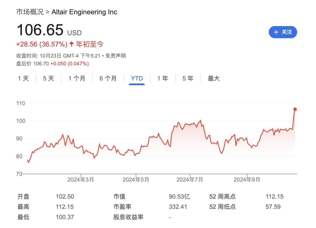 今年以来,Altair 股价已上涨 市值达到27% 91 亿美金。