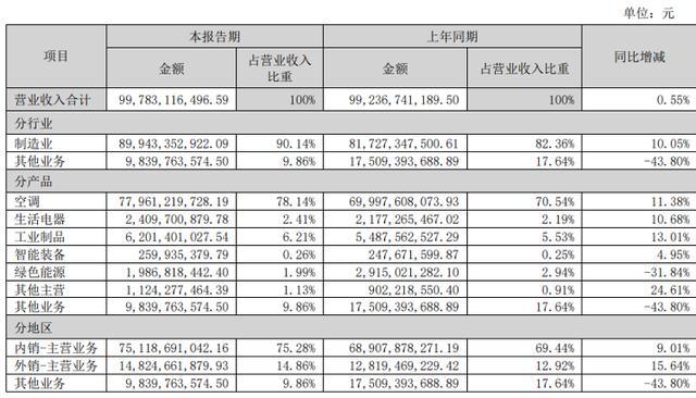 根据2024年上半年的财务报告,格力的整体收入达到1002.87亿元,同比增长0.50%,其中空调业务收入达到779.61亿元,占营业收入的78.14%,同比增长7.61亿元。%。