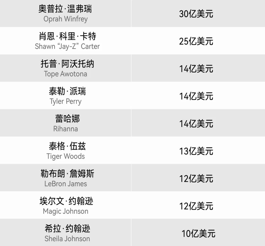 也有几个黑人亿万富翁,他们也是415个身家十亿的美国人之一,但他们的财富仍然不足以让他们进入福布斯400富豪榜。包括: