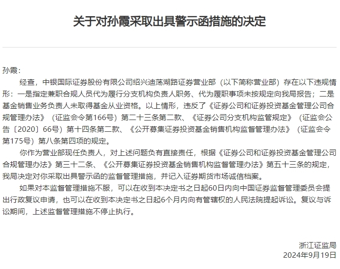 对于这一点,浙江证监局向绍兴营业部和现任负责人孙霞分别发出警告函,并将其纳入诚信档案。