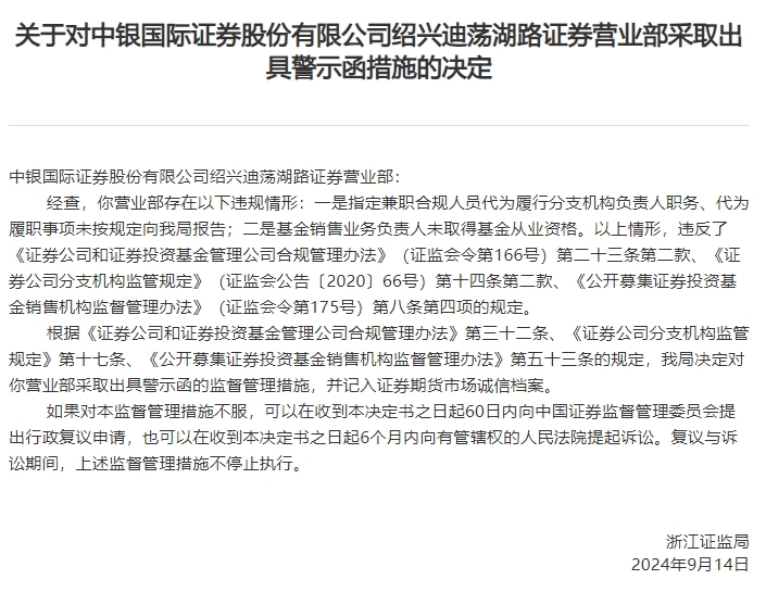同时,中国银行国际证券绍兴迪荡湖路证券营业部(以下简称绍兴营业部)也因管理漏洞受到处罚。经调查,绍兴营业部存在以下违规行为:一是指定兼职合规人员代为履行分支机构负责人职位,未按规定向我局报告履行职责;二是基金销售业务负责人未取得基金从业资格。