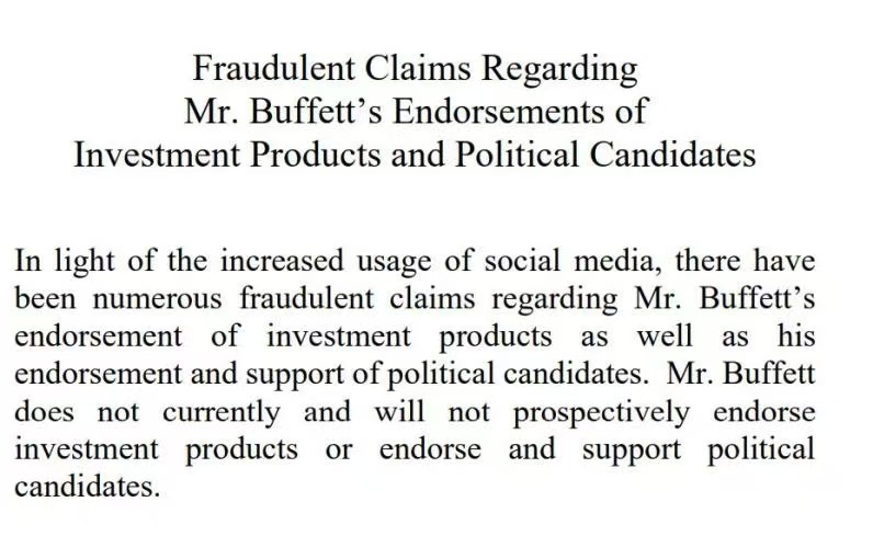伯克希尔哈撒韦公司的声明称:“鉴于社交媒体的使用越来越多,关于巴菲特对投资产品的背诵以及他对政治候选人的背诵和支持有许多欺诈性的说法。巴菲特目前和未来不会支持投资产品,也不会支持政治候选人。”