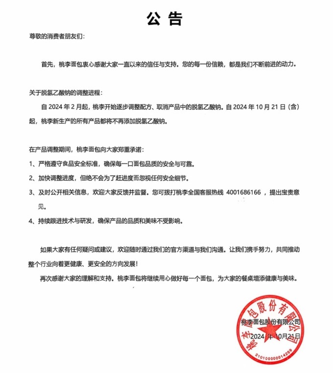 桃李面包表示,自2024年2月起,桃李开始逐步调整配方,取消产品中的脱氢乙酸钠。自2024年10月21日(含)以来,桃李新生产的所有产品都将不再添加脱氢乙酸钠。