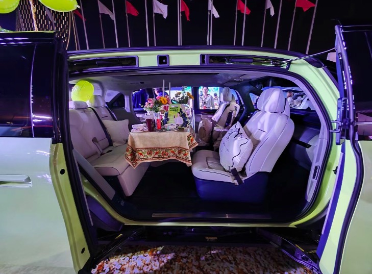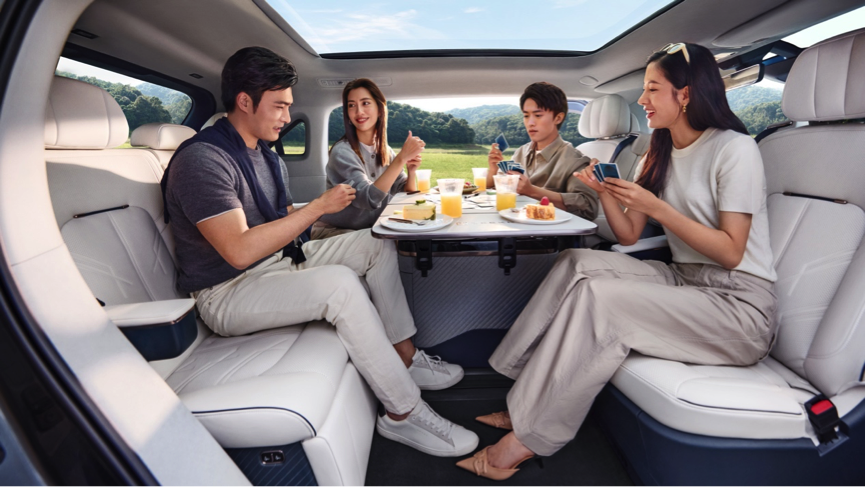 中岛(中央扶手箱)采用全平地板设计,可前后移动。、以及前排和后排可以自由转动的座椅,这款车可以实现多种场景——前排和后排可以面对面交流玩游戏,前排和后排可以当床睡觉,前排可以放在中间放儿童帐篷,副驾驶可以稍微向后移动,与前排和后排“交头接耳”...