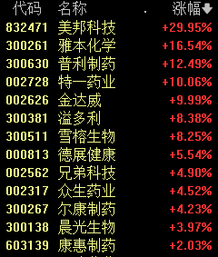 今天上午,医药股上涨,NMN概念涨幅最大,生物制药、维生素、动物疫苗等板块也大幅上涨。美邦科技、雅本化学、普利制药等股票大幅上涨。