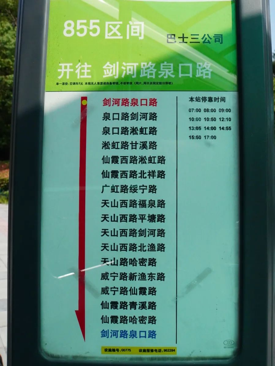 记者在实地走访起点站时,注意到站台增加了显眼的855路区间站牌和线路示意图,设计直观清晰,方便乘客快速获取信息。沿途有15个站点,涵盖泉口路、淞虹路、仙霞西路、迎乐路、广虹路、绥宁路、天山西路、威宁路、仙霞(西)路等重要道路,全程约50分钟后返回剑河路泉口路。值得注意的是,该线路仅在工作日运行,服务在周末和法定节假日暂停。发班间隔约50-60分钟,票价2元/人,首末班车时间固定为7。:00和17:00。