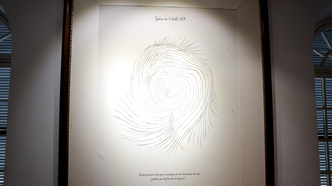 最早的气候信号符号也可以在这里看到。1906年,在气象观测站观察到的气象信息将传达到在外滩设置的信号塔。只要看到过去的船只的信号旗,就可以知道最近的天气情况,尤其是台风的相关信息。上海也成为台风预警最早发布的地区。这里还可以看到徐家汇观象台第一任台长能恩斯手绘的台风框架图,他当时还画了第一张台风路径预告图。