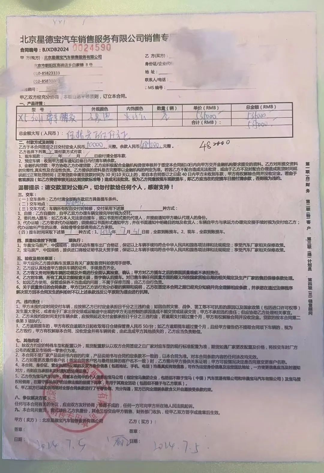 顾客蓝蓝说:“我今年6月在星德宝定的宝马i3。当时合同规定我可以在8月底拿车,但是车没有交付,所以我让店家退押金,店家回复后一周内就可以退了。然而,这一流正在等待跑步。”