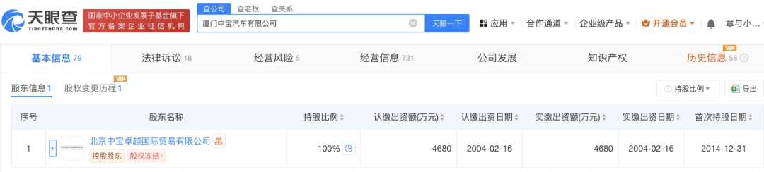 天眼查数据显示,北京星德宝汽车销售服务有限公司股东为天津天宝汽车销售服务有限公司和厦门中宝汽车有限公司(以下简称厦门中宝)。这两家公司的背后,都指向北京中宝卓越国际贸易有限公司(以下简称北京中宝)。该公司今年9月被冻结股权,或者出现了严重的资金链问题。