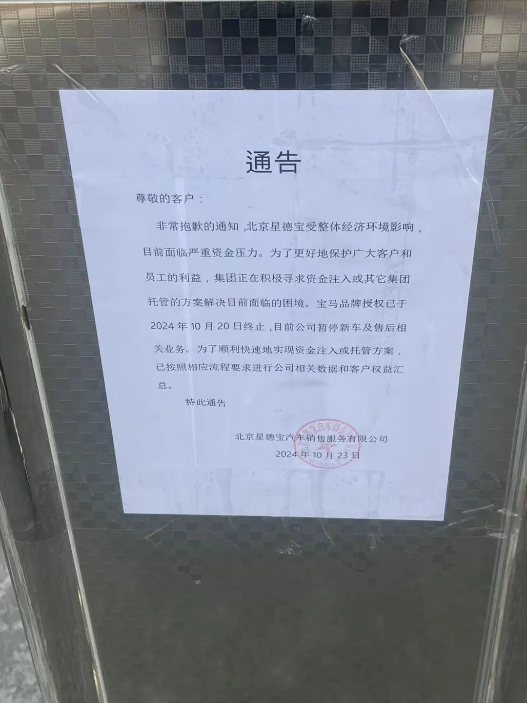 通知显示,受整体经济环境影响,目前经济压力严重。为了更好地保护客户和员工的利益,集团正在积极寻求资金注入或其他集团托管方案来解决目前面临的困难。宝马商标授权于2024年10月20日停止,公司暂停新车及售后相关业务。