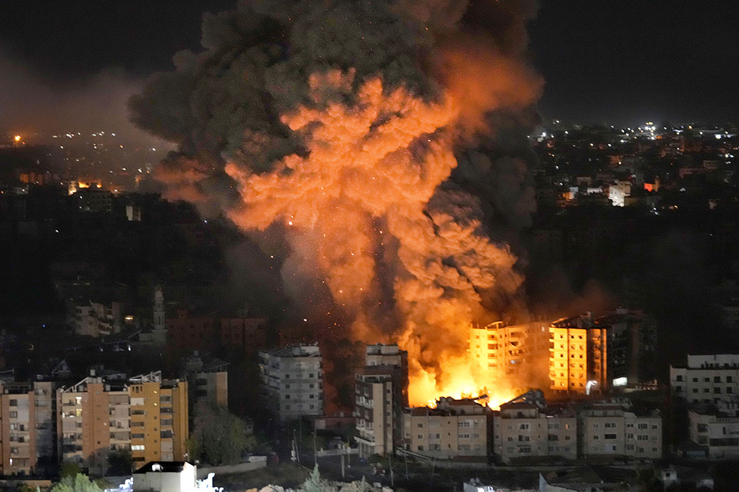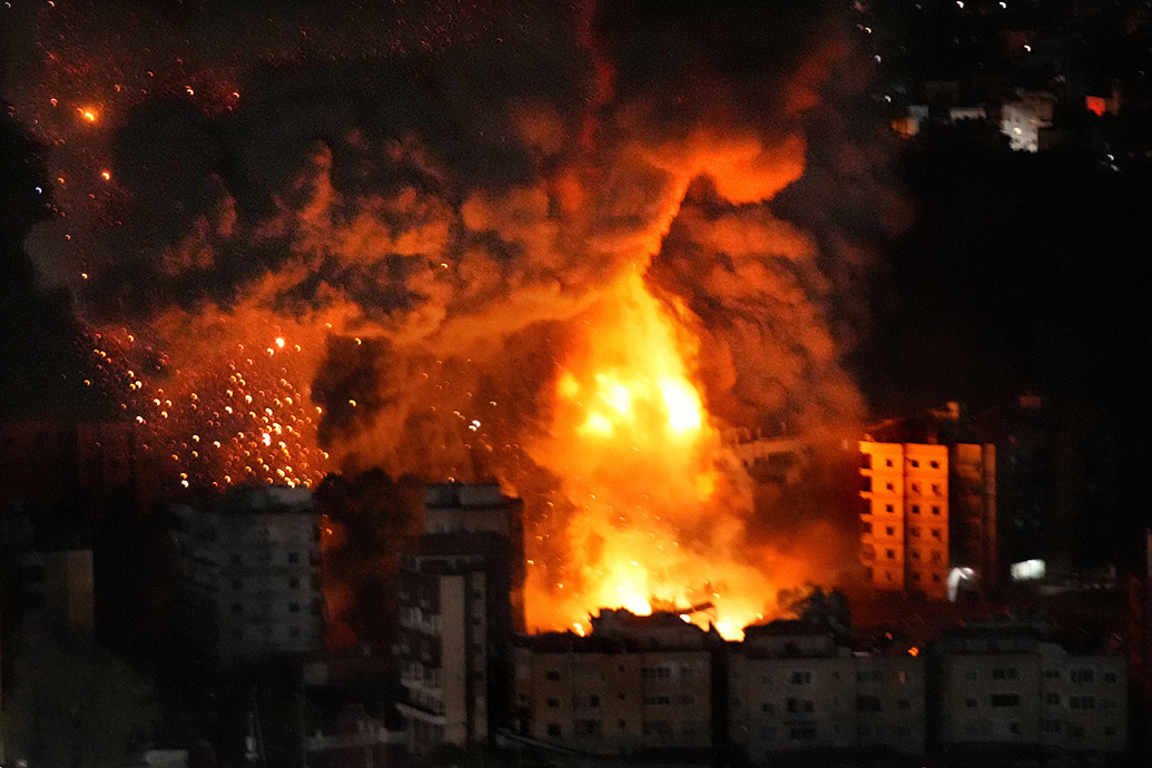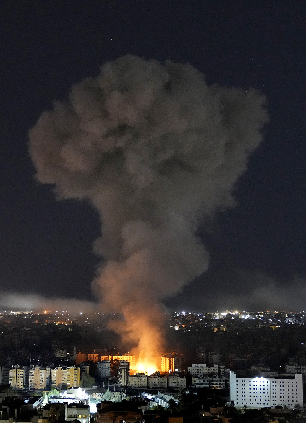 当地时间2024年10月23日星期三,黎巴嫩贝鲁特南郊达希耶被以色列轰炸,建筑物内升起火焰和烟雾。
