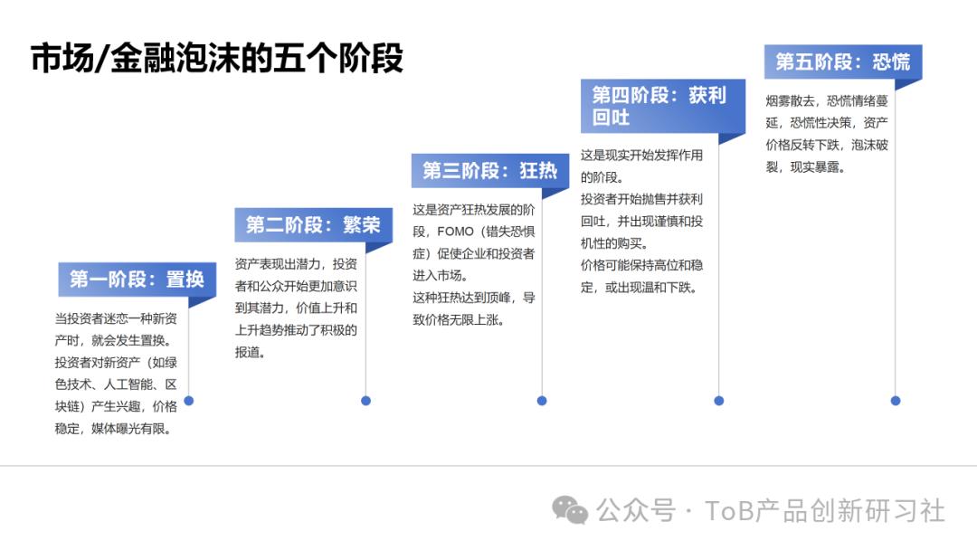 就像金融体系中的很多泡沫事件一样,AI市场的泡沫也在逐渐显现,目前应该处于第三和第四阶段。(阶段不是按照一定的顺序进行的)
