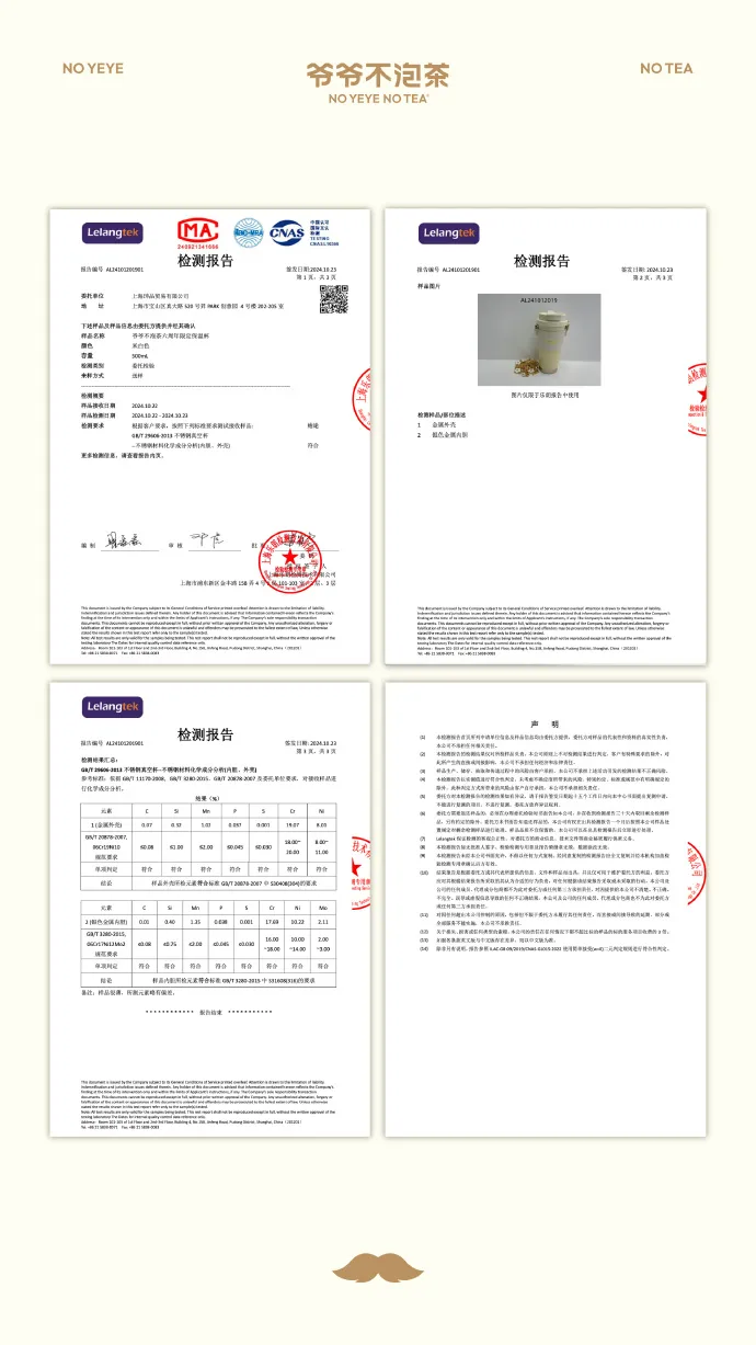 据上海乐朗检测技术有限公司发布的《检测报告》显示,送检‘爷爷不泡茶六周年限定保温杯’符合GB/T3280-2015S31608(316)标准要求。本批保温杯的金属内胆化学成分为316不锈钢。