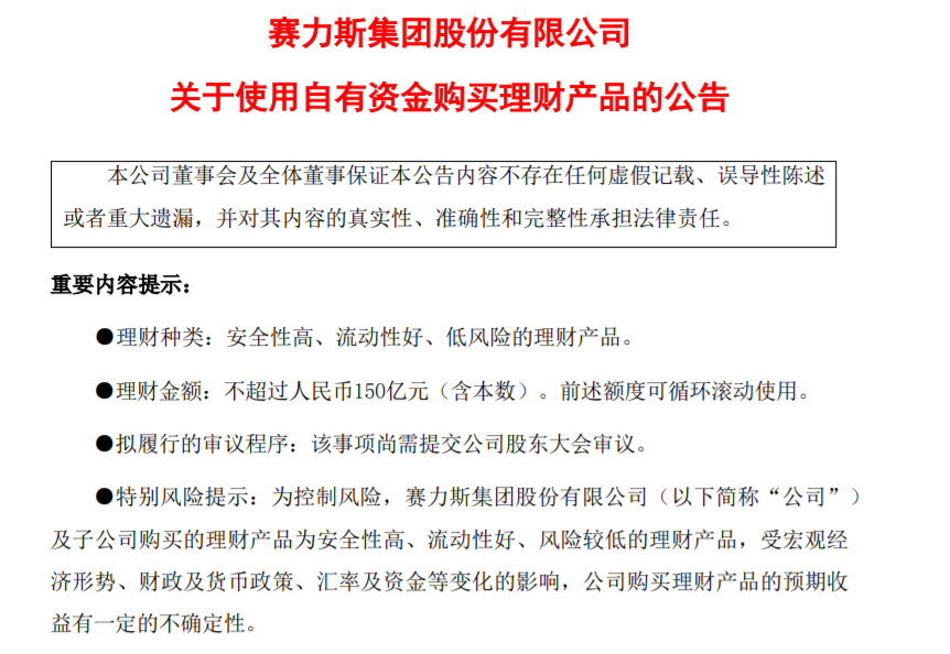 所以,当赛力斯宣布要花150亿元购买理财产品时,很多网友质疑,这真的有那么多钱吗?