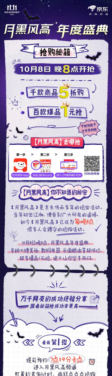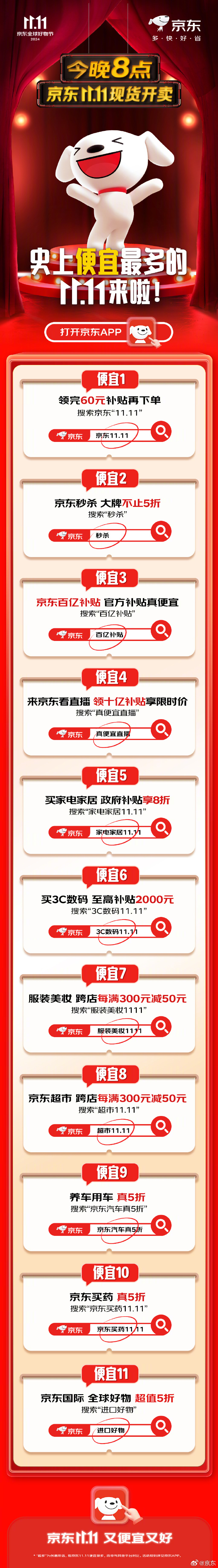 今年的双11,JD.COM“月黑风高”频道频道推出了1000种商品5折购买、1元抢购100种商品的活动区,于10月8日晚8点开放。10月14日晚8点,JD.COM双11现货销售。活动方面,60元额外补贴,JD.COM秒杀,JD.COM100亿元补贴各种福利。