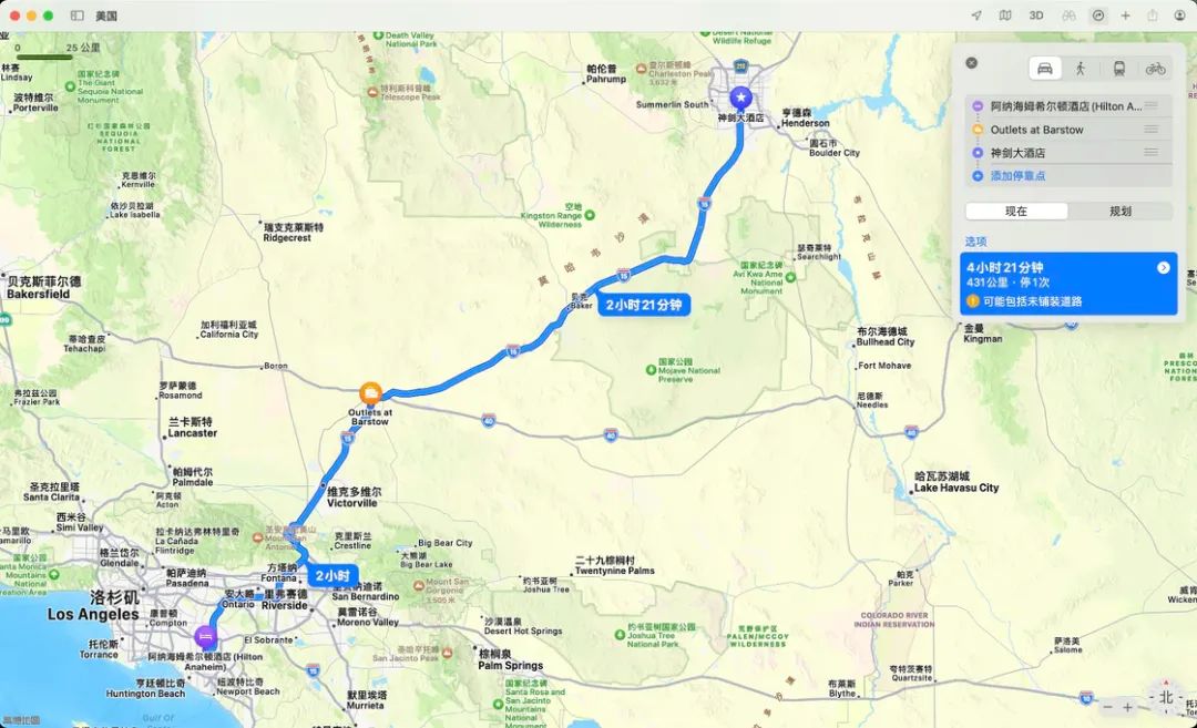 从 Anaheim 经停 Barstow 前去 Las Vegas 行程参照