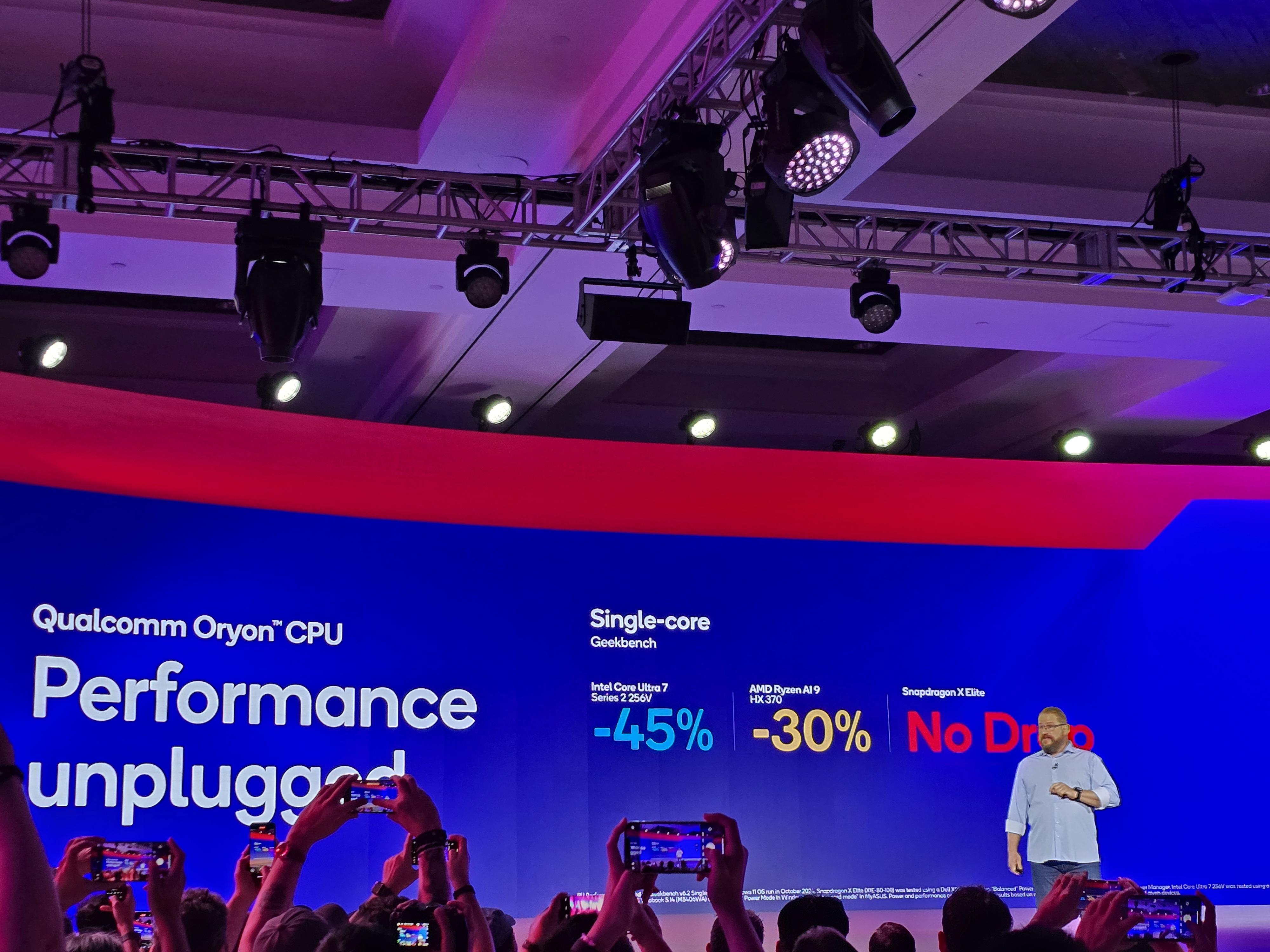 高通在新闻发布会上毫不犹豫地展示了与竞争者Intel和AMD的对比结果。