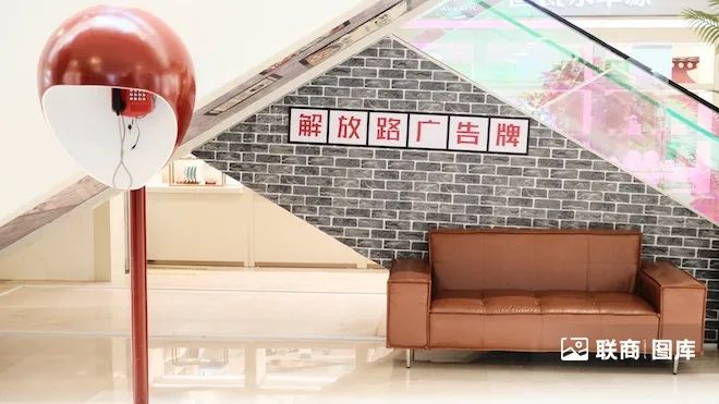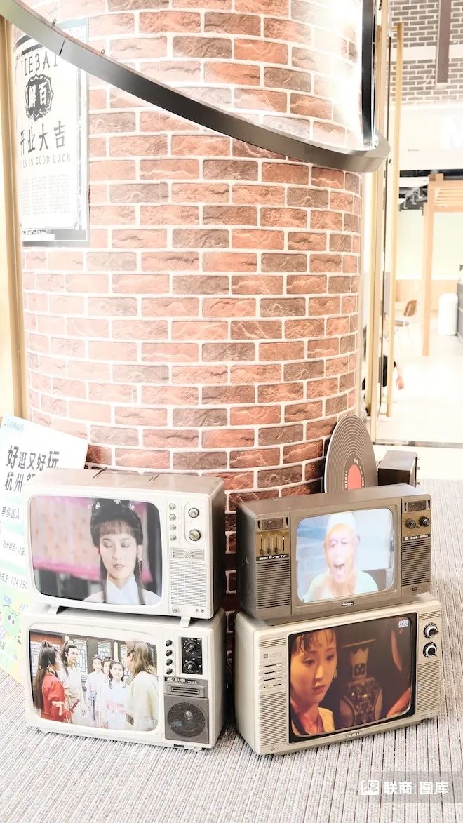 正门砖红色圆柱上“欢迎来杭州解百”“一秒钟穿越80年代”的显眼口号,西游记、上海滩、红楼梦、射雕英雄四大复古电视循环播放,表达了解百A座的定位是复古怀旧风格。