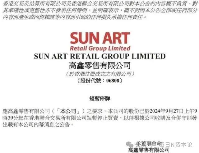 近日,多家媒体报道称,知名超市大润发总公司高鑫零售有限公司(以下简称高鑫零售)以执行董事兼首席执行官沈辉的名义发布公告,称将于9月27日上午在香港证券交易所短暂停牌,以备根据企业收购合并标准发布乘载本公司内幕消息的公告。