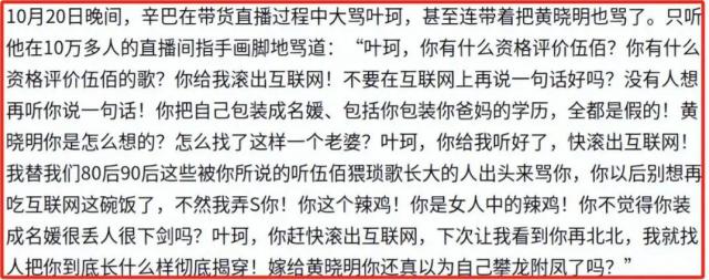 尤其是辛巴,自称是伍佰的忠实粉丝,在直播中对叶珂破口大骂,问她有什么资格评价伍佰,让她滚出网络,说她是女人的垃圾。