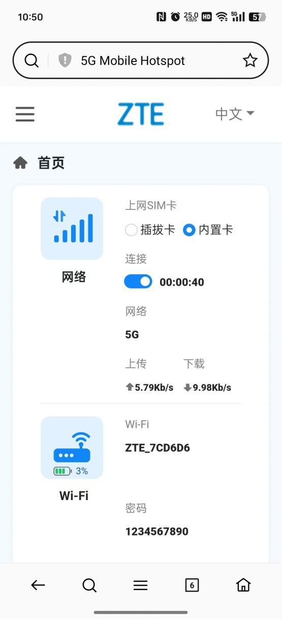 开始激活中兴 U30 Air 亚太版提供插拔卡和内置卡两种连接模式。值得注意的是,如果你想使用官方的内置流量卡,你需要长按转换为内置卡模式,显示蓝色。 Wi-Fi 在连接设备之后,图标可以改变网关的方式。