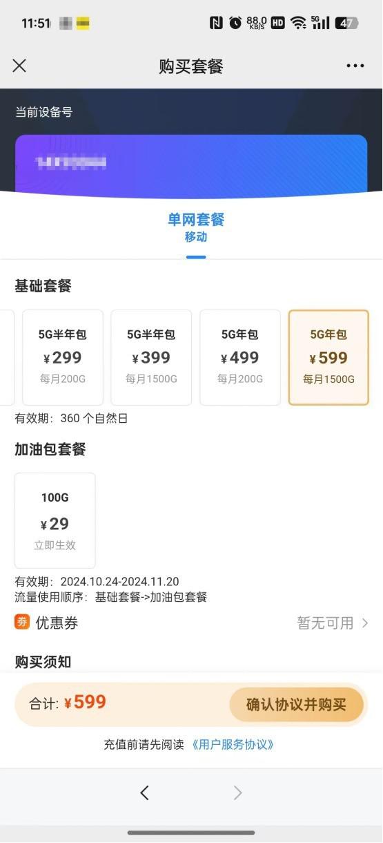 相信大家最关心的还是套餐费用问题,这里最低套餐是 29 元每月 50GB 全国性流量,最高 79 元每月 1500GB 全国流量,官方承诺全程高速流量。这个价格不贵,最值钱还是最值钱? 599 元年包,每月也是如此 1500GB,折算不到一个月。 60 元素,便宜很多。