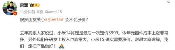 雷军决定小米 15 将涨价 部件涨价很多 不可能 3999 了