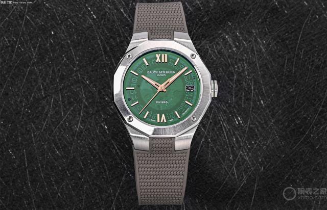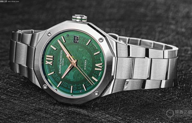 在表壳的另一侧,八角形手表由精钢制成,上面有精心设计的绿色线条,与表盘的颜色相呼应;并雕刻品牌的浮雕徽标 Φ,不仅方便佩戴者操作,而且增加了手表的识别度。