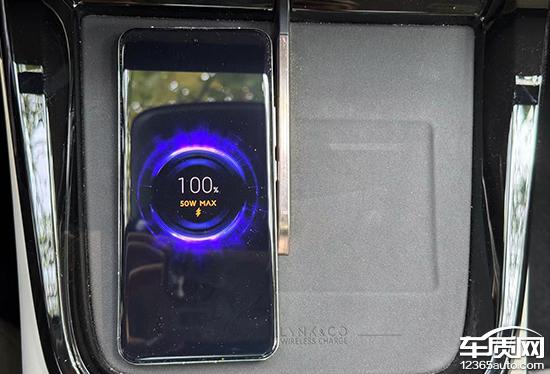 评估车在前杯架前部配置 1 个 50W 移动电话无线充电板,位置更合适,取放更方便。值得注意的是,无线充电板还配有散热口,排热效果更好。
