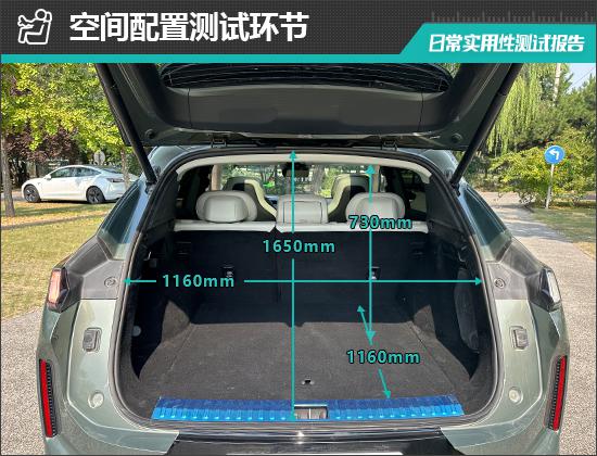 对评估汽车后备箱的基本值,我们也进行了实测,张口长度为 1650mm;张口宽度为 1160mm;后备箱进入深度 1160mm;后备箱台与上面的垂直高度为 730mm。