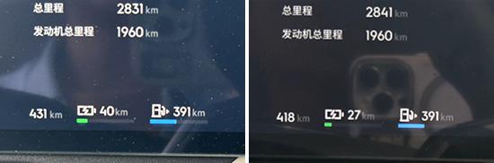 实际测试中,将车内空调温度调节至 24 ℃,开启纯电优先方式。行驶路线通过城市道路和环路,平均速度为 50 ± 2km/h。到达目的地时,车辆显示的里程增加了 13公里,降低续航里程 13公里,即平均每行驶13公里。 1km 耗费的续航里程大约是 1km。