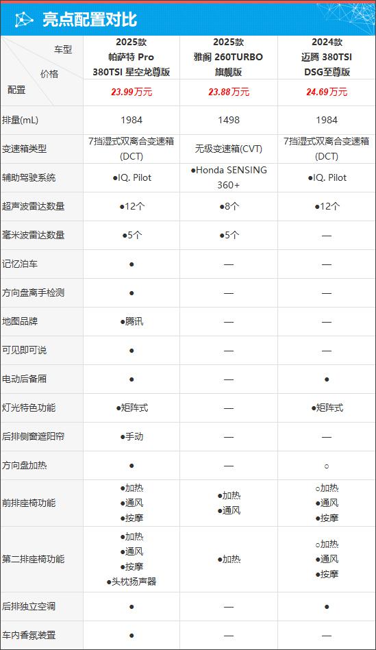 在配置对比阶段,我们选择了 3 顶配车型进行比较。通过配置对比不难看出,广汽本田雅阁在动力装置和整体装备性能上都不如帕萨特。 Pro 和一汽 - 大众迈腾,其中智能和舒适配置缺乏较多。帕萨特 Pro 和一汽 - 与大众迈腾相比,虽然后者的价格要贵一些,但是整体装备并没有什么优势,甚至帕萨特 Pro 还占据了记忆停车、可见即可说、车内香味装置等,配备性能更好。