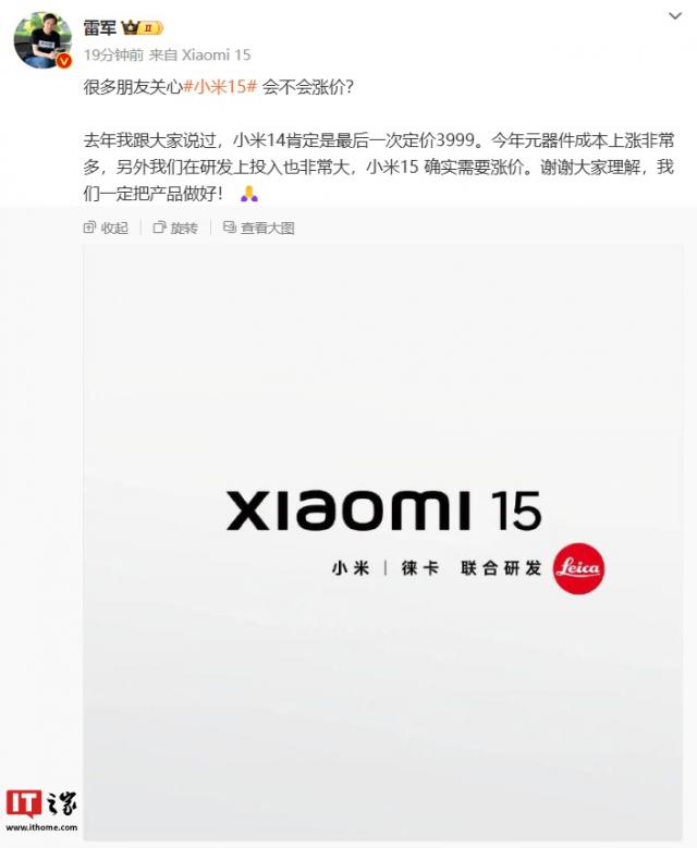 董事长兼董事长小米创始人 CEO 今天雷军发文回应小米。 15 一系列手机是否会涨价:小米 14 一定是最后一次定价 3999。今年的元器件成本大幅上升,另外我们在研发上的投入也很大,小米 15 价格确实需要上涨。