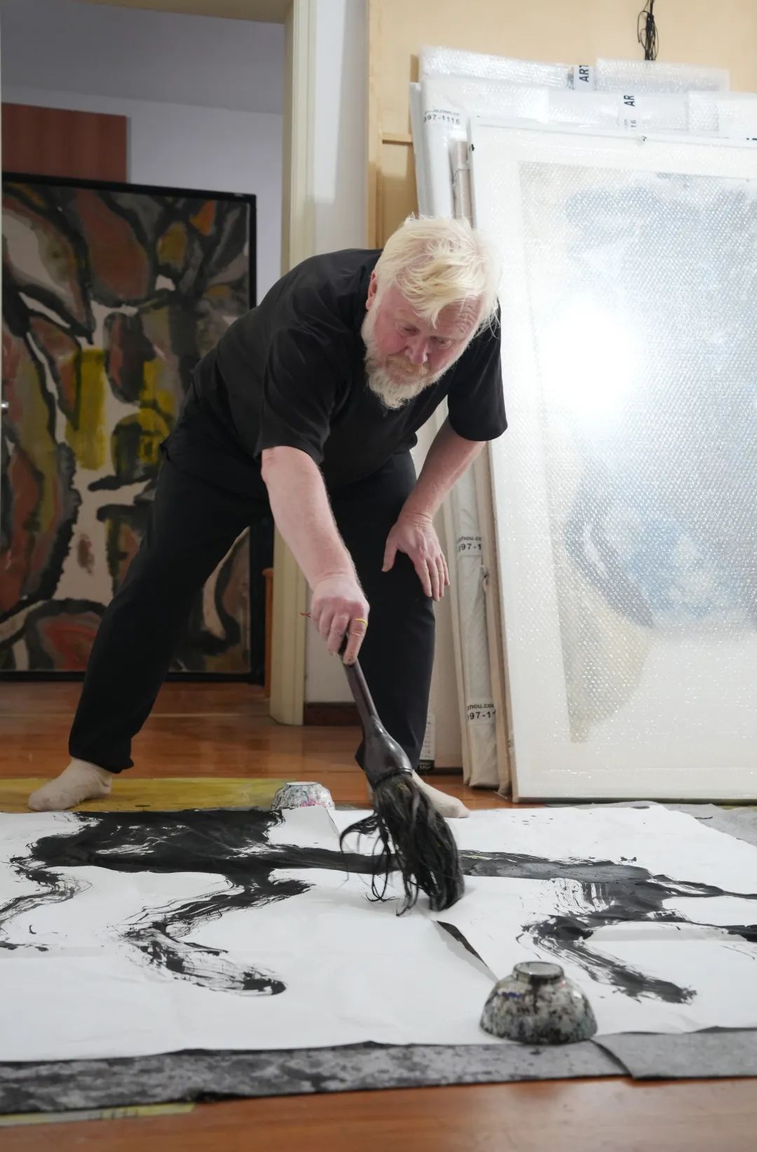 日前,复旦大学法国籍教授魏明德在上海杨浦区的一栋住宅楼里专注于创作。他赤裸着双脚站在画纸上,左手拿着一支巨大的软笔,左手用颜料给软笔涂上颜色。魏教授凝神定气,俯下身,坚定地落在画纸上。接着,他的画笔时而柔和细致,时而奔涌豪爽,水墨运转之间,一幅精美的画作渐渐显露出来。最后,魏教授用软笔沾水,不规则地抖掉画作,水墨逐渐晕染,幻化成型,令人叹为观止。水墨画自由流动,魏明德教授完全沉浸其中。他用心感受着水墨画的魅力和画纸的质感。这部作品完美地融合了他内心的想象力和情感。