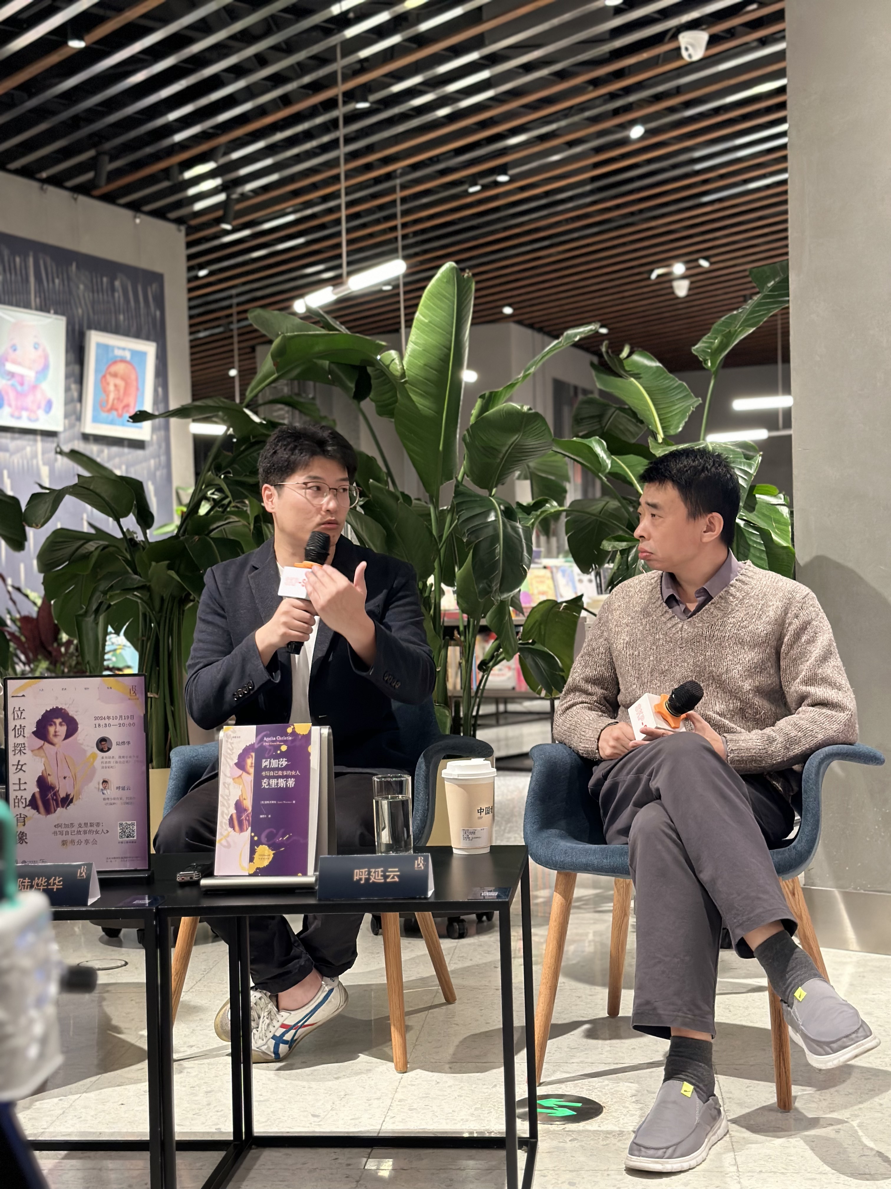 活动后半段,陆烨华和呼延云就“阿加莎式阴谋”这个话题进行了讨论。在分享的时候,陆烨华提到,这些阴谋有的是由爱伦·坡、柯南·道尔等前辈作家传承下来的,有的是阿加莎自己的创新。而且这些阴谋中的许多都具有明显的时代特征。例如,在阿加莎生活的时代,阶级观念非常清晰——一个无家可归的人不会穿绅士的衣服。而且阿加莎也会利用这一点,在小说中误导读者。呼延云提到了一个非常重要的问题,那就是阿加莎绝对不是象牙塔式的写作,而是有很强的市场意识。阿加莎有着极其丰富的生活经验,她将自己的生活融入到小说创作中,两者并非脱节,这对她来说是一大优势。