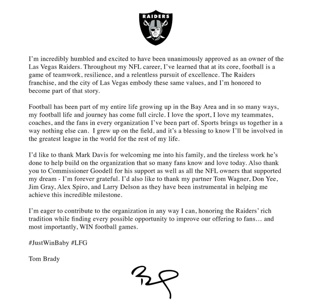 在社会媒体上发布的公开信中,布雷迪的兴奋跃然纸上,「在我的打球生涯中,我学会了橄榄球的核心是团队合作、坚强不屈和对卓越的不懈追求。突袭者和拉斯维加斯都体现了这些相同的价值观,我很荣幸成为这个故事的一部分。」