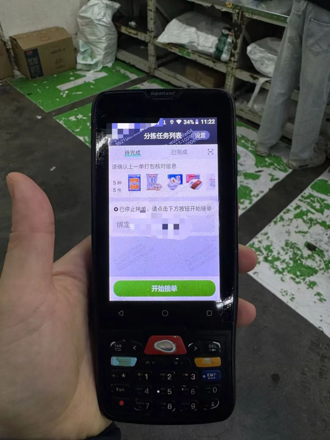 第一天,店长安排了店里的一个分拣员小寒带我去。不久,我发现小寒是这里的金牌分拣员。她右手拿着分拣终端机。(PDA),左手装满大大小小的袋子,穿过一排排货架。只要单子来了,PDA就会来。小寒一边挑货一边给我看,根据手里的PDA数字定位到具体的区域和货架上,然后扫码,按照规定把货物放进包里。