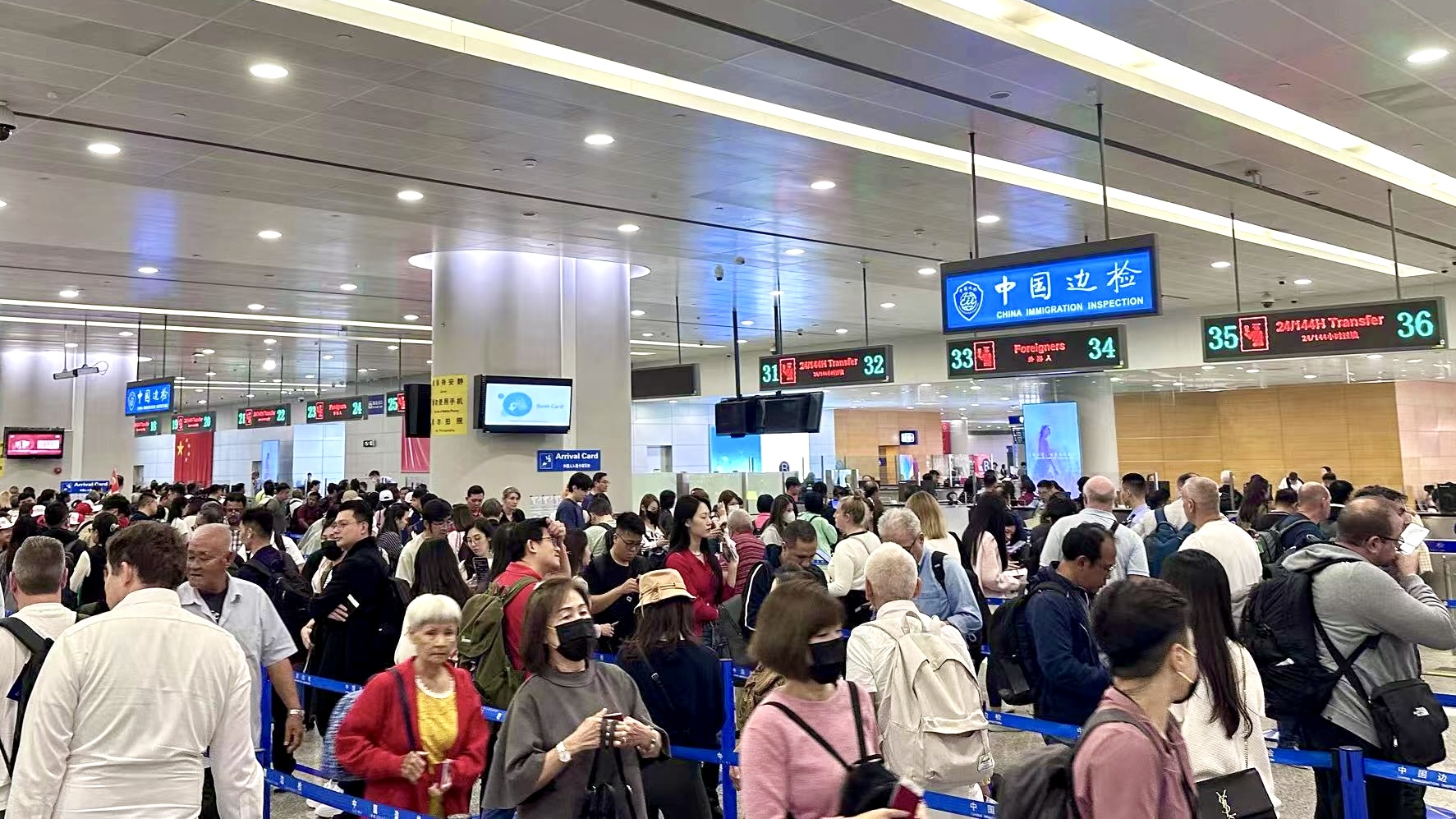 浦东国际机场边检现场游客络绎不绝。尹慧 摄